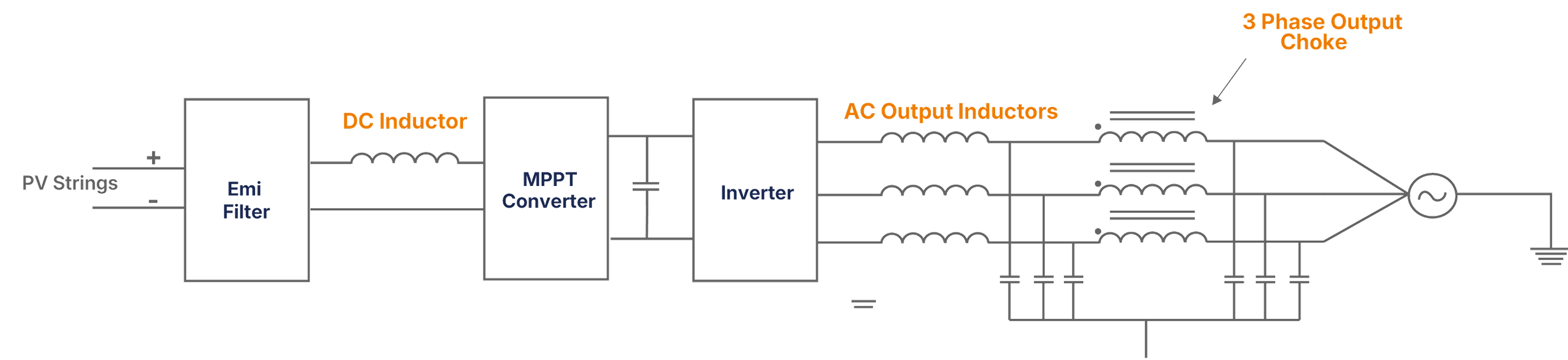 DC Inductors in the DC/DC MPPT Converter Block are needed as energy storage inductors for the step-up converter. AC Output Inductors and 3 Phase Output Chokes are present in the DC/AC Inverter block to filter high frequencies and to permit a clean 50/60Hz output voltage for the grid. The magnetic components should be suitable to operate between 8kHz and 25kHz switching frequency.